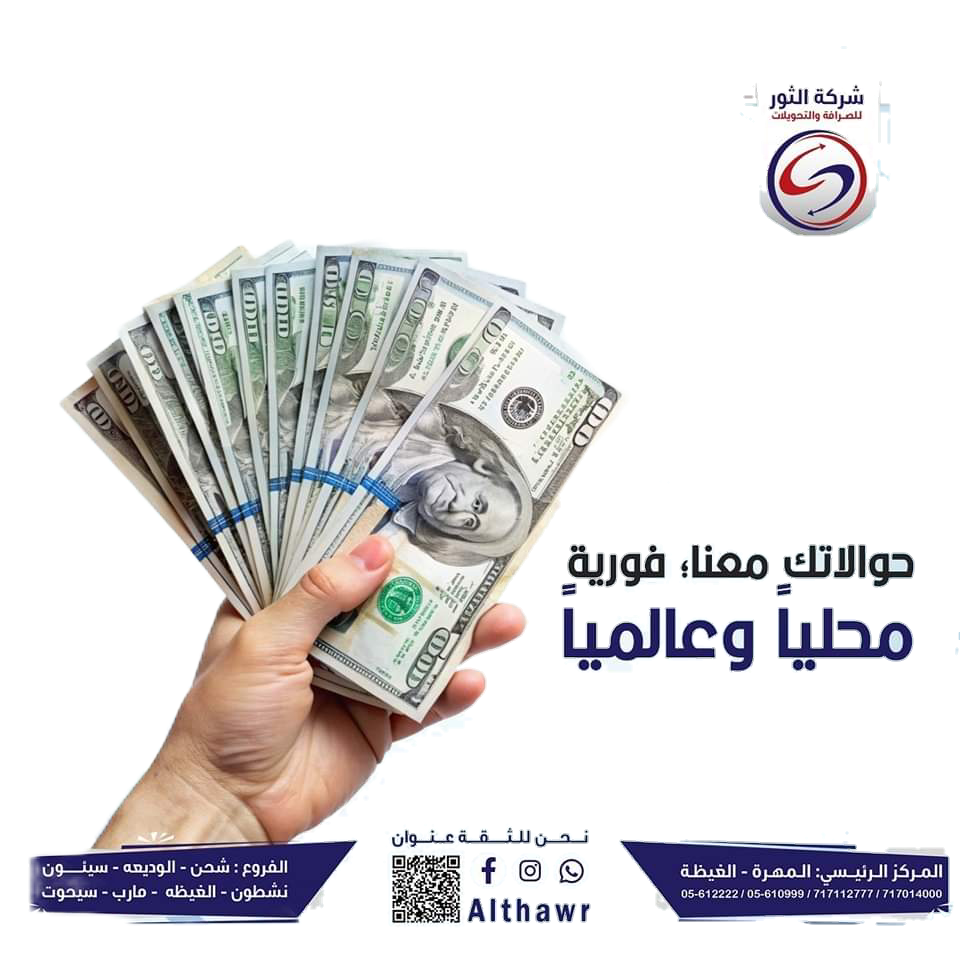 تعد شركة الثور للصرافه من الشركات الرائدة في الاسواق المحلية حيث توفر خدمات مميزة لعملائها في جميع المجالات من صرف جميع عملات العالم والتحويلات المالية لكافة انحاء العالم بالاضافة للتحويلات البنكية لجميع البنوك بأعلى المواصفات والمعايير لتقديم أفضل الخدمات وباحدث السبل بما يتناسب مع جميع متطلبات ورغبات عملائنا المالية والمصرفية بامان وسهولة وسرعة عالية وبافضل الاسعار، محافظين على مصداقية الشركة على مر السنين من العطاء المتميز وجودة الخدمات المقدمة لعملائنا من أفراد وشركات مما كسبنا قاعدة كبيرة مبنية على الثقة العالية